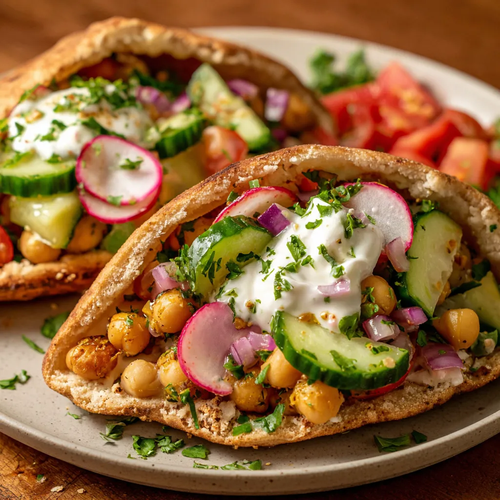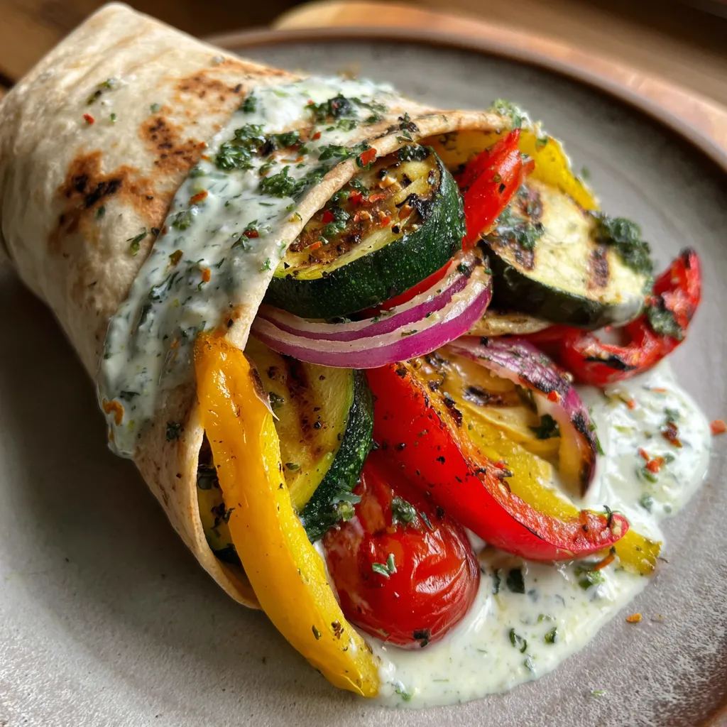Charred zucchini, peppers, and onions mingle with juicy cherry tomatoes and creamy hummus in a warm wrap, brightened by a tangy herb-packed yogurt sauce that pops on your palate.
